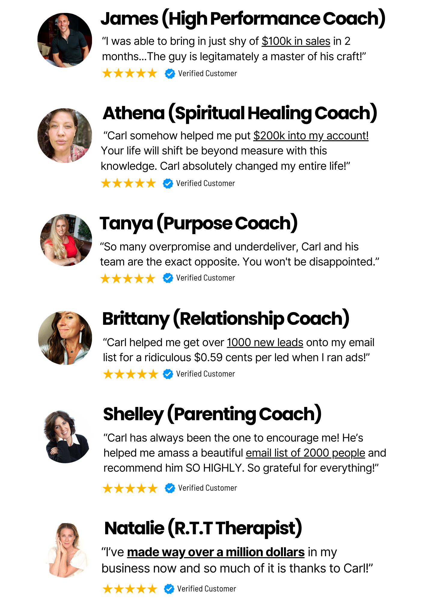 We’ve eliminated guesswork and frustration for you. Just follow our proven “Coach Freedom Engine” steps and you’ll finally attract clients, automate your marketing, and reclaim your life - without endless trial, error, or wondering if you’re doing it right.