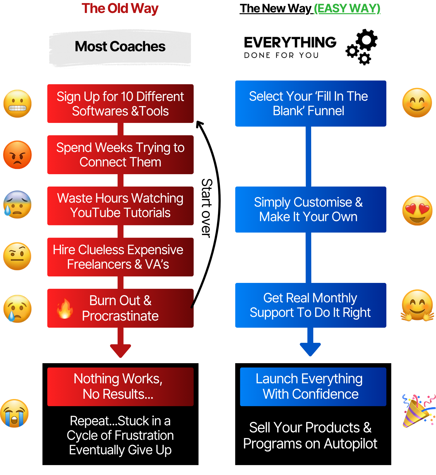 For comparison, most coaches are currently paying $500-700+ per month across multiple platforms and still don't have everything they need. Everything Done For You gives you everything for a fraction of the cost.
