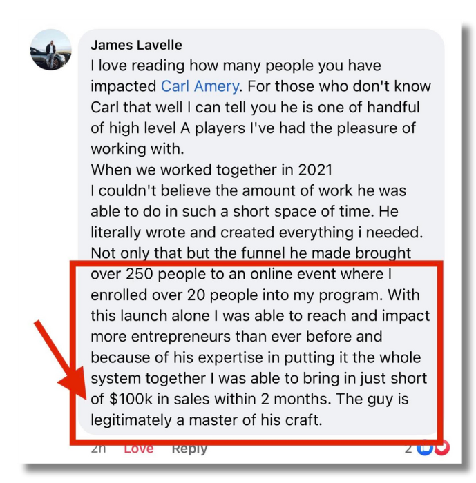 "I was able to bring in just shy of $100k in sales in 2 months." - James
